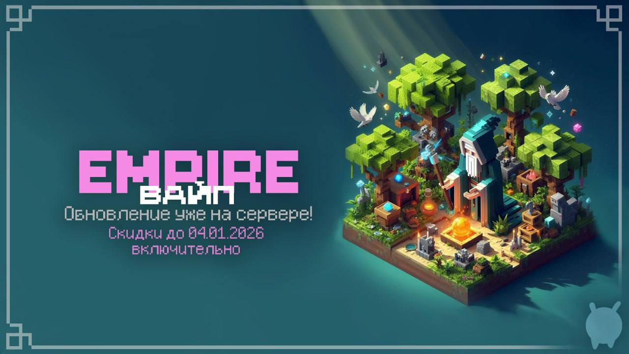 Вайп и обновление Empire: новые приключения ждут вас! Сервер снова онлайн и готов к приему игроков! Мы провели работу над обновлением, и теперь вас ждет новый игровой опыт. Что нового было добавлено? • Добавлена система квестов которая проведет вас по всему контенту. • Изменены/добавлены крафты: развитие стало сложнее и интереснее. • Переработаны Эндер-мир и Ад • Добавлены декоративные блоки из новых версий для ваших построек Покупайте товары в нашем внутриигровом магазине (/shop) со скидкой 20% до 04.01.2026 включительно. Успейте воспользоваться этой возможностью и начните приключение по выгодной цене. ️Первый, кто выполнит все квесты и отправит скриншот-подтверждение в Личные сообщения канала, получит на выбор 500 бонусных вимеров или привилегию Premium на месяц.