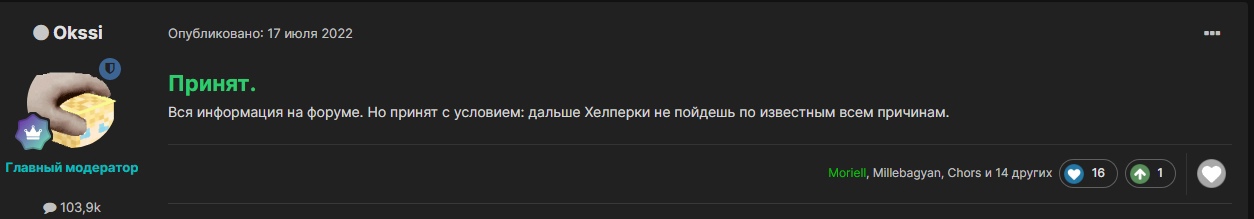 EKO_14 Опубликовано: 21 февраля 2023 Опубликовано: 21 февраля 2023 23 часа назад, ItzLayben сказал: 1. Желаемая должность - Хелпер. 2. Время игры на сервере (должно быть не менее наигранных 48 часов) - 28 дней. 3. Ник в игре - ItzLayben 4. Настоящее имя - Никита. 5. Возраст - 17 лет. 6. Есть опыт в этом деле? (где, кем, когда, кто может подтвердить) - Опыт есть, два года был главным администратором и разработчиком на сервере у друга. Подтвердить могут друзья, бывшие коллеги и игроки сервера. На данный момент хелпер CivCraft'a. Подтвердить может Администрация. 7. Сколько часов в день вы готовы посвятить нашему проекту? - От 1-го до 8-ми часов, зависит от учёбы. 8. В какое время обычно играете (по Москве) - В будние дни с 17:00 - 22:00, в выходные дни с 12:00 - 23:00. 9. В какой стране и городе проживаете? - Гомель (Беларусь). 10. Почему вы хотите занять эту должность? - На протяжении длительных лет пребывания на проекте я замечал немало нарушителей. И в следующие года, их количество росло. Я бы хотел поспособствовать исправлению этой проблемы. Хочу принести пользу игрокам и проекту. 11. Прочитали ли правила нашего проекта? - Да, прочитал. Обязуюсь непредвзято рассматривать нарушения от игроков на форуме и в игре. 12. Напишите немного о себе - Никита, 17 лет. Достаточно давно играю на данном проекте.Учусь на 3-м курсе в колледже. По характеру я: спокойный, весёлый, добрый и ответственный. Увлекаюсь футболом , просмотром фильмов и путешествием по другим странам.В свободное время занимаюсь спортом и играю на данном проекте, люблю гулять на улице с друзьями. 13. Ссылка на Вашу страницу ВКонтакте (Личка и страница должны быть открытыми! А так же вы должны оставлять ссылку с вашим настоящим ID, состоящим из цифр, а не вами придуманным) - https://vk.com/id275338263 удачки ItzLayben 1