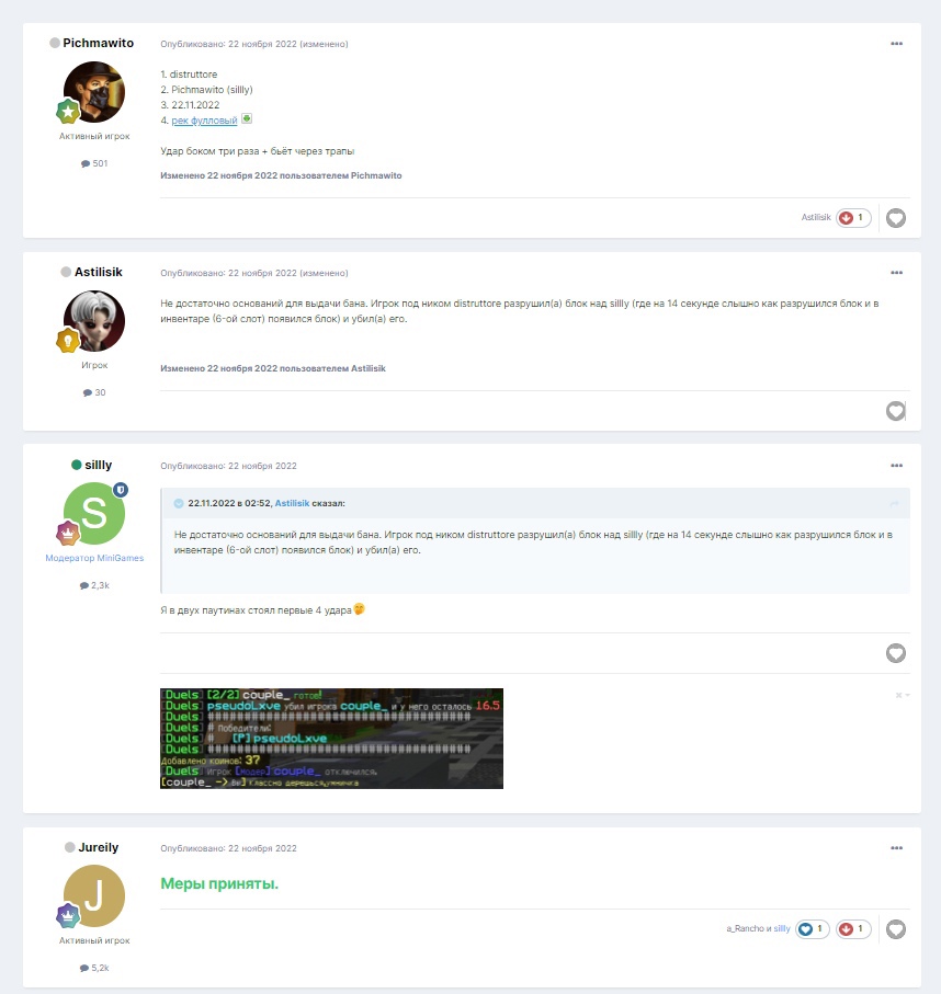 mistresss Опубликовано: 6 марта 2023 Опубликовано: 6 марта 2023 10 часов назад, frugalscissors сказал: привет, КОТЯТА разберем выше вами написанное, просьба ответственных администраторов прочитать и ознакомиться, это не обычный хейтспич, я за то, чтобы на сервере появлялись новые хелперы, но тут человек просто банально не подходит. во-первых у человека отлетает аккаунт (один раз перманентно ЗА ЧИТЫ) и в целом аккаунт в бане неоднократно находился (могу так же пруфануть скринами с форума). стоит ли давать хелпера человеку, которого банили раз 7-8+? вопрос риторический. во-вторых, у человека 3+ акка/твинка, что уже причина бана, и уж тем более кмк причина не выдввать модерку: distruttore, berdushina_, disenfranchised и ещё, я уверен, несколько аккаунтов, что проверяется по ip, просьба администраторов тоже посмотреть, если присутствует такая возможность. а тебе, Катя, я желаю удачи в том, чтобы получить модерку и если бы не нарушения выше, я честно был бы за твою кандидатуру. жаль, что всё выше при объективной администрации (где у тебя, по-моему, куча друзей)), должно ставить крест на том, чтобы тебе выдали модерку. а ещё жаль, что это сообщение скорее всего останется нерассмотренным и модерку ты всё-таки получишь. ладно. даси, о/с/э, рассказсобака, подвалпоэтов и что, что был бан за читы??? с нарушения должен пройти 1 месяц, чтоб можно было подать на должность (3 Твинка это мало) заявка нормик удачи disenfranchised 1