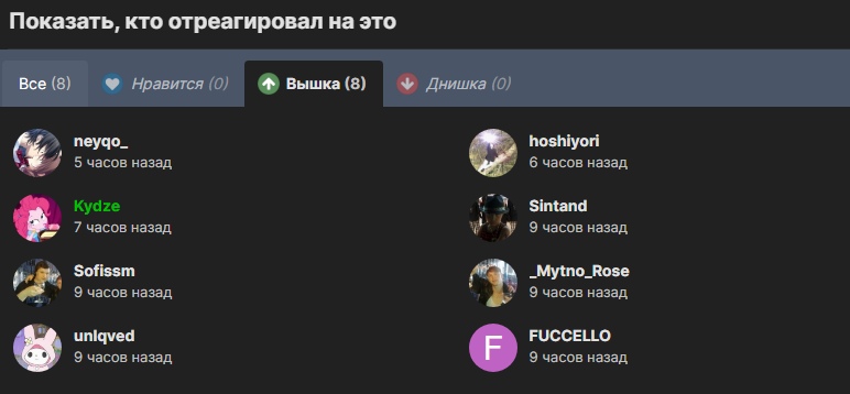 _Mytno_Rose Опубликовано: 20 марта 2023 Опубликовано: 20 марта 2023 6 часов назад, Festival сказал: одни и те же Ты бы ещё весь город попросил тебе вышку поставить, а тайному днишку никого не нужно просить ставить заслуженные реакции. просят только если надо поддержать ложь и создать лжецам видимость поддержки: ну раз ты зачем-то заговорил об этом, мб сам и живёшь с друзьями в таком мирке медвежьих услуг, в таком случае сочувствую..) пока что я вижу что @TAYHbIY очень избегает этот неудобный вопрос 14 часов назад, _Mytno_Rose сказал: Lirika320mg, panasonbka, 4ynga_4anga_, 777sofka, oraculpro_, koka_leka - вам ни о чём на тот момент не намекала такая фабрика сменённых свежерегнутых акков у ОДНОГО человека, за несколько часов игры с вами? и как же он сам вам объяснял + как вы себе в голове объясняли это столь необычное явление?) очень интересная картина вырисовывается)) conasteo 1