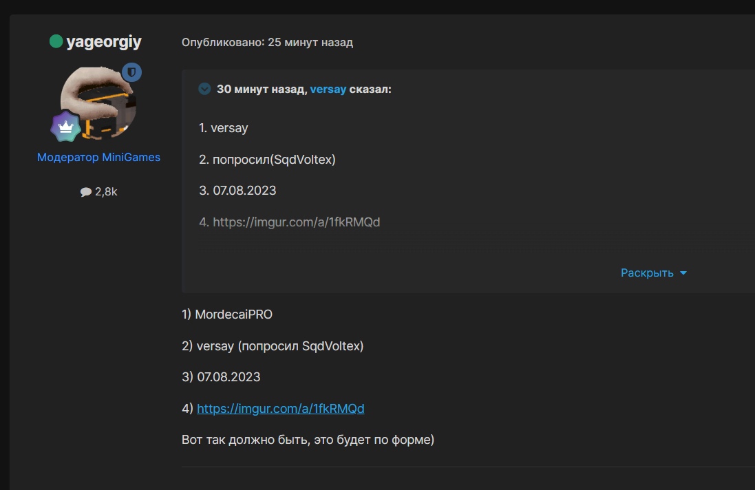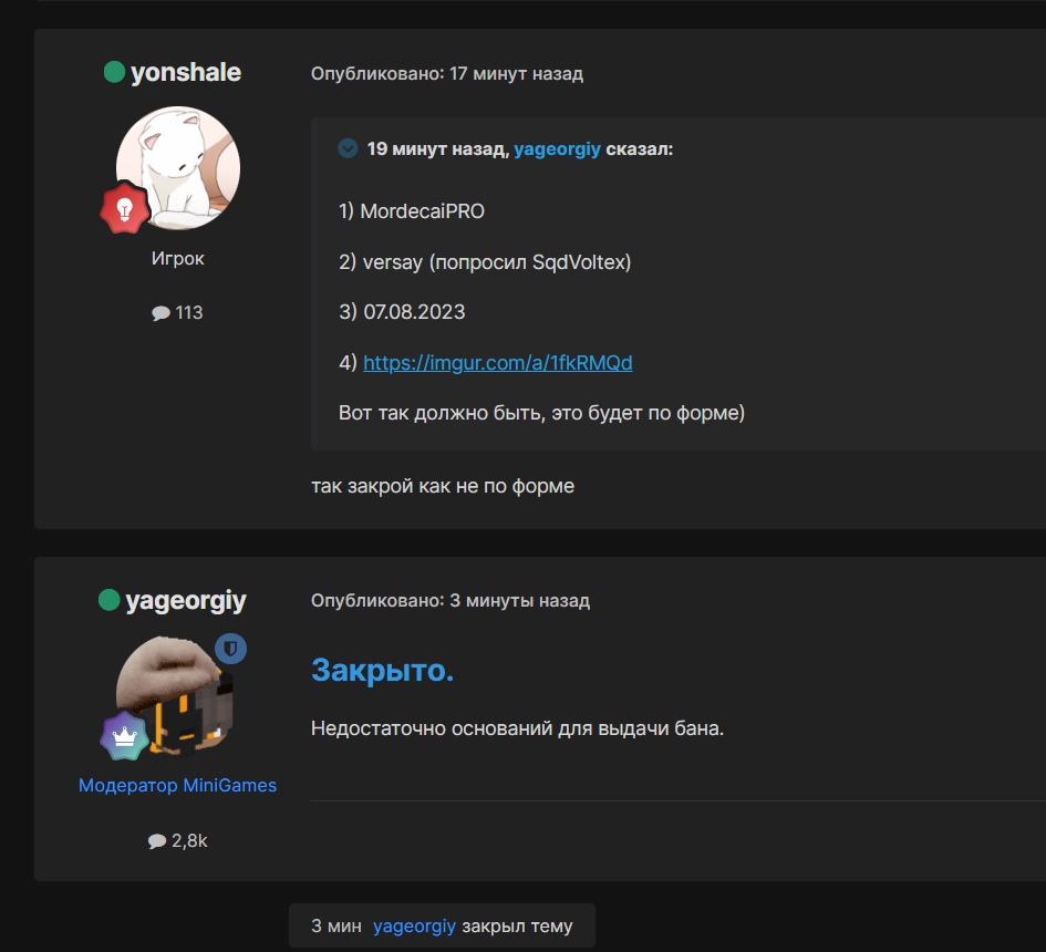 sentimentality Опубликовано: 9 августа 2023 Опубликовано: 9 августа 2023 24 минуты назад, 3Jlou_Agent сказал: Почему не по форме, если игроки из первого и второго пункта есть на скрине? Недостаточно, все верно Потому что нет игрока "попросил" (?) Такой ник даже в априоре нельзя зарегистрировать