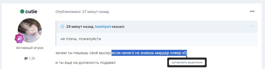 hoshiyori Опубликовано: 19 августа 2023 Опубликовано: 19 августа 2023 1 минуту назад, cutie сказал: даже на этом режиме который мы не играем мы топ1 принял друг 1 минуту назад, cutie сказал: ты 30 минут думал что написать или че после своего последнего ответа я отошел, вернулся, но ты продолжаешь самому себе противоречить =) 1 минуту назад, sentimentality сказал: ты не понимаешь, мардер мистери включает элементы пвп, поэтому он топ 1 этого режима фактик, не зря я говорил, что лук это часть пвп