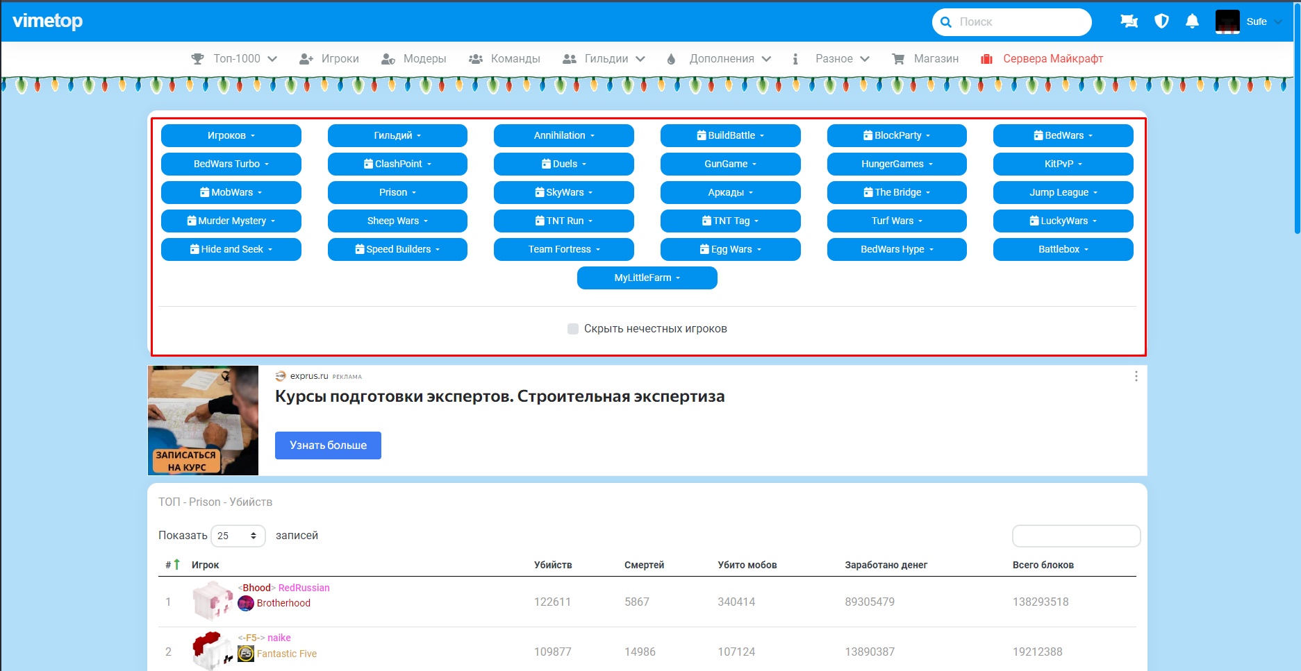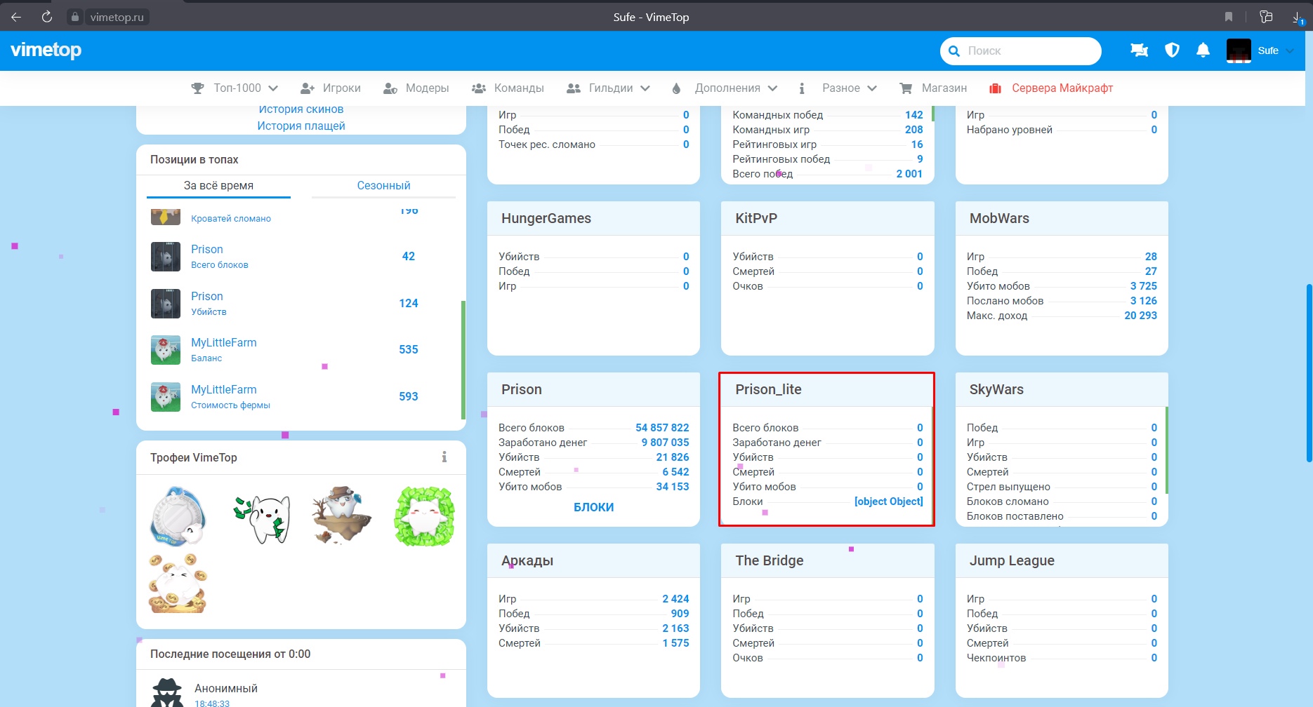 Sufe Опубликовано: 22 декабря 2023 Опубликовано: 22 декабря 2023 Хочется, чтобы Vimeworld предоставил доступ к статистике Prison Lite на замечательном сайте VimeTop. На страницах профилей игроков есть статистика,но ее нет в топ-1000. Anime_bou и AuBuKOPE3_TyT 2