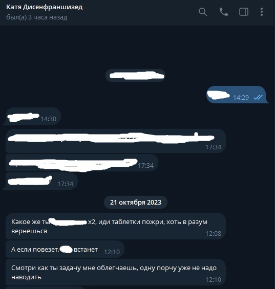 Festival Опубликовано: 17 февраля 2024 Опубликовано: 17 февраля 2024 13.02.2024 в 22:41, doTopiez сказал: Ты показываешь человека не с лучшей стороны, давая ему понять только о части слитой переписки и миксуя это смайлом В смысле части, если это полная переписка, и там это видно?) 13.02.2024 в 22:41, doTopiez сказал: Это стрёмный мув, не говоря уже ничего о тебе, как о личности Я лишь показал, что человек токсичный, да и ты, думаю, не особо общался-то так с ней А вот реально стрёмным мувом я могу это назвать