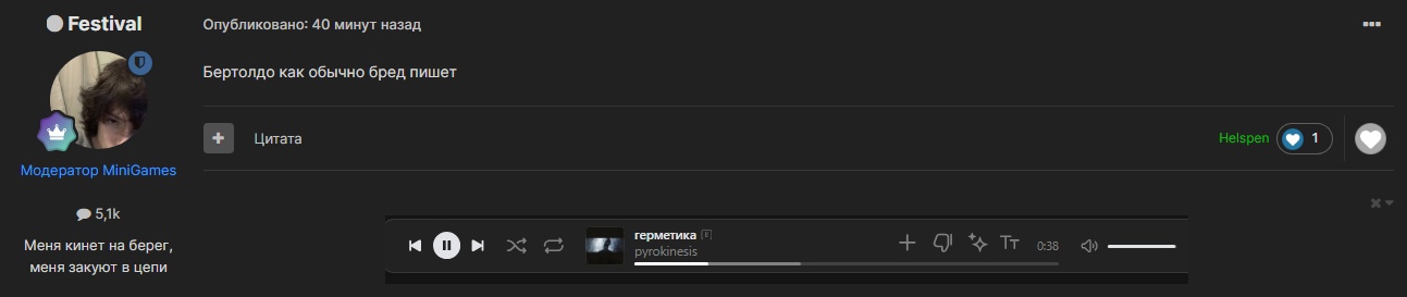 skeet Опубликовано: 17 июля 2024 Опубликовано: 17 июля 2024 1 minute ago, dekite said: Festival @Festival Flqrance Неуважение к игроку https://forum.vimeworld.com/topic/1336606-2-момента-есть/page/2/#comments 17 июля 2024 форум 1 inhume 1