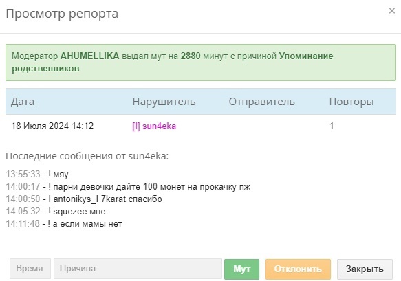 AHUMELLIKA Опубликовано: 19 июля 2024 Опубликовано: 19 июля 2024 (изменено) Доказательства нарушения, без контекста, который раскрывает игрок, получивший наказание: Скрытый текст В следующий раз будьте аккуратнее и уточняйте, ведь по репорт чату непонятно, когда вы говорите о своём родственнике, а когда о чужих =( А ещё рекомендую на подобные сообщения, как у игрока n0vak, отправлять репорт чат Изменено 19 июля 2024 пользователем AHUMELLIKA