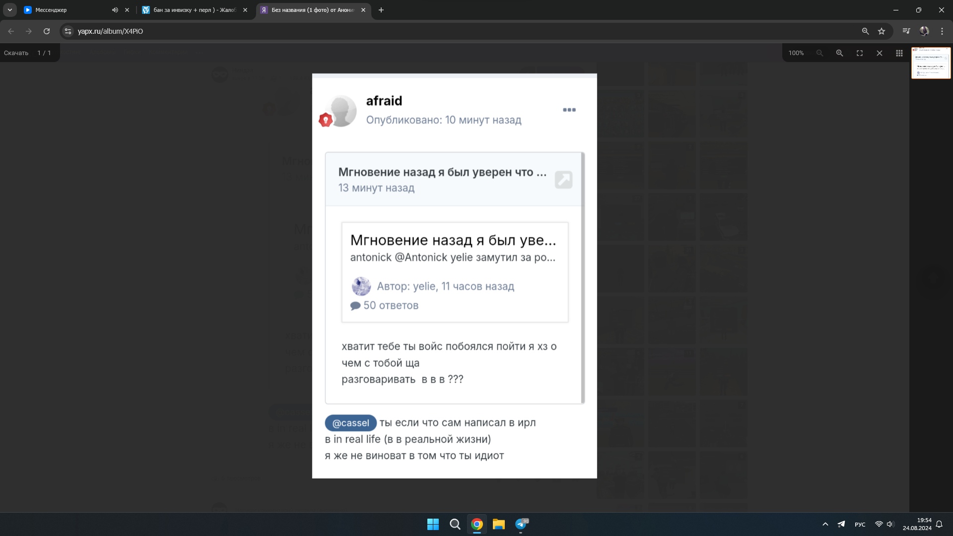 Monday Опубликовано: 24 августа 2024 Опубликовано: 24 августа 2024 Только что, 321 сказал: теперь покажи СВОИ сообщения выше бедный рак тебя везде забанили что в тра что в игре https://imgur.com/a/2GXYCtG