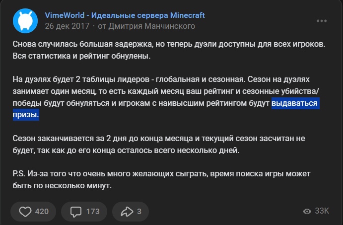 Gold_Sniper2 Опубликовано: 7 октября 2024 Опубликовано: 7 октября 2024 (изменено) Скрытый текст 10 часов назад, Unravell сказал: Никогда не писал такого рода темы, да и думаю, её не заметит Администрация Но, как по мне, очень многие ждали обновления дуэлей, которое давным-давно обещали и тизерили. С того времени про режим такое чувство, что забыли Показать содержимое Посидев на форуме, можно понять, что большое количество игроков до сих пор конфликтуют в темах и играют на победу. Это значит, что режим всё ещё живёт и имеет своё комьюнити. Игроки продолжают, без какой-либо выгоды для себя, создавать видео исключительно по дуэлям, создают локальные беседы в вк/тг/дискорде. Многие создают гильдии и играют под определённым тегом, считая это "командой" (?). Что я хочу сказать? Большинство игроков, которые три года назад играли исключительно в дуэли, всё ещё иногда заходят в игру и ждут обновлений для этого режима. Я считаю, что такой режим, который привлекает множество игроков на западных серверах, не может быть проигнорирован. Вот пример одного из самых популярных серверов с пвп на версиях 1.7.10-1.8.9, который по-прежнему поддерживает высокий онлайн и имеет различные режимы, специфицированный исключительно на дуэлях Показать содержимое Вот аналогичный сервер на более высокой версии, который также по пвп на данный момент Показать содержимое Я хочу высказать своё мнение, так как в общей сумме со всех аккаунтов я имею более 30к+ побед, которые были набиты за пару лет, в основном в режиме на зельях/оп Я перестал серьёзно играть в дуэли уже около девяти месяцев, но, как и многие другие, продолжаю ждать обещанных обновлений —————————————————————————————————————————————————————————————————— Вот несколько идей, которые я хотел бы предложить: Начнем с китов: Зелья: На данный момент кит выглядит так: Показать содержимое Многие уже предлагали это, но и я выскажу своё мнение: я предлагаю полностью изменить концепцию этого режима или добавить его вторую версию. На мой взгляд, она будет намного успешнее текущей. Вот несколько примеров того, что стоит изменить или добавить в китах: Показать содержимое • Изменить/добавить эффект "Зелья скорости I", заменив его на "Зелья скорость II" • Желательно добавить "Эндерперлы" и поставить кд на использование ≈ 15 секунд • Добавить на меч зачарованние на "Заговор огня II" • Добавить зелье "Огнеупорности" на 8 минут Показать содержимое Пояснение для тех, кто не играет в такие режимы и может задаться вопросом: зачем одновременно добавлять "Заговор огня" на меч и "Зелье огнеупорности"? • В майнкрафте есть такая особенность: когда ты горишь, отдача от ударов значительно меньше, даже если ты не получаешь урон от огня • Убрать вечную "Насыщенность" от еды, чтобы на дуэлях появился голод • Добавить разновидность еды (пример на скрине) • Добавить возможность игроку заменить один любой предмет в инвентаре на другой (например, одно из трёх зельев скорости на зелье хила) • Убрать/Удалить/Уничтожить "Компас" (желательно на всех режимах) из инвентаря и заменить его на любой другой предмет, например, на дополнительное зелье хила (если речь про поты) Показать содержимое За семь лет существования режима компас использовался в основном тогда, когда была возможность ломать блоки, зарываться под ними и прятаться от других иг