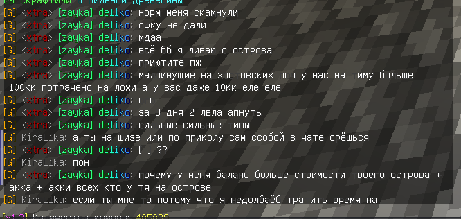 Anourch Опубликовано: 3 апреля Опубликовано: 3 апреля 6 часов назад, KiraLika сказал: 1. mute 2. https://vimetop.ru/player/mute 3. Kiralika 4. Изменения : Невкупил что мут дал игрок с ником мут, простите .Спасибо кто объяснил. Но факт остаётся фактом, при неадекватном поведение deliko, кинули мут за то, что я не выдержал и высказал недовольство в грубоватой форме по поводу его засорения чата, притянув этот мут даже не за оскорбление (что можно было дать как причину. Как позже перечитал, мог задеть его), а за "неадекватное поведение". Учитывая скорость мута и необоснованность в прицнипе, я остаюсь при мнение что персонаж делико связан с этим мутом. Проект не оскорблял, то что он полумёртвый в сравнение с прошлым - факт, плохим я его не называл, падение популярности и плохой проект - разные вещи. Эти разжовывания на случай если у человека всё таки кто-то за него муты даёт, и он закроет эту тему по этим причинам. 5. (Весь чат, почему я сгорел, сообщение "ливай отсюда" и сразу мут, и его общение в принципе. Он явно достойнее меня для этого мута.) 6. 03.04.2025 сервер MiniGames, skayblok 7. Постоянно ведёт себя подобным образом. Так же повторюсь, это всё происходило слишком быстро, в час ночи, при том что я проявил не неадекватное поведение, а скорее сравнением мог задеть хрупкие чувства человека который постоянно в чате с другими лидерами разводит непойми что. Слышь жалобу удаляем KiraLika 1