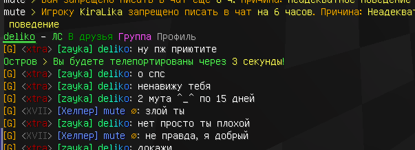 deliko Опубликовано: 4 апреля Опубликовано: 4 апреля 03.04.2025 в 03:40, KiraLika сказал: 1. mute 2. https://vimetop.ru/player/mute 3. Kiralika 4. Изменения : Невкупил что мут дал игрок с ником мут, простите .Спасибо кто объяснил. Но факт остаётся фактом, при неадекватном поведение deliko, кинули мут за то, что я не выдержал и высказал недовольство в грубоватой форме по поводу его засорения чата, притянув этот мут даже не за оскорбление (что можно было дать как причину. Как позже перечитал, мог задеть его), а за "неадекватное поведение". Учитывая скорость мута и необоснованность в прицнипе, я остаюсь при мнение что персонаж делико связан с этим мутом. Проект не оскорблял, то что он полумёртвый в сравнение с прошлым - факт, плохим я его не называл, падение популярности и плохой проект - разные вещи. Эти разжовывания на случай если у человека всё таки кто-то за него муты даёт, и он закроет эту тему по этим причинам. 5. (Весь чат, почему я сгорел, сообщение "ливай отсюда" и сразу мут, и его общение в принципе. Он явно достойнее меня для этого мута.) 6. 03.04.2025 сервер MiniGames, skayblok 7. Постоянно ведёт себя подобным образом. Так же повторюсь, это всё происходило слишком быстро, в час ночи, при том что я проявил не неадекватное поведение, а скорее сравнением мог задеть хрупкие чувства человека который постоянно в чате с другими лидерами разводит непойми что. бред а не жалоба, всё верно тут