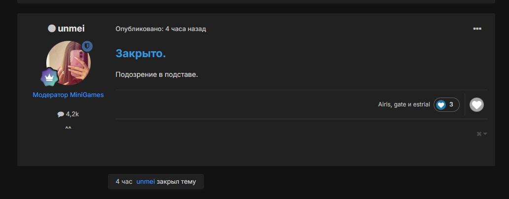unmei Опубликовано: 6 августа Опубликовано: 6 августа (изменено) Ты сама намеренно ломала защиту своей команды, и сама же писала об этом другому игроку, чтобы он сломал вам кровать. Так что если кого и банить - так это тебя, а не невиновного игрока, которому ты же и пыталась заруинить игру Изменено 6 августа пользователем unmei silentfxxlings, reasonn, dekiteiru и 4 других 5 1 1